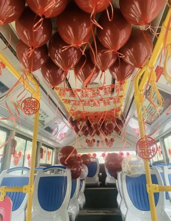 走進車廂,車窗玻璃、扶手桿、座椅等位置都被紅“囍”字、“新婚快樂”掛件、祝福語舉牌等精心裝點,讓整輛公交車充滿了甜蜜溫馨的氛圍,十指相扣的新郎新娘臉上充滿了幸福的笑容。伴隨著陣陣笑語歡聲,新郎新娘在眾多親朋好友的陪伴下,一起登上這輛“浪漫婚車”,駛向名為“幸?!钡南乱徽?。